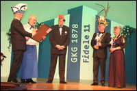 Unser 1. Karnevalistischer Termin in Blau-Weiß fand am 4.Nov. 2011 im Stadtwaldhaus statt. Unser neues Bühnenbild vom Vorjahr kam unter Anleitung von Ralf-Herbst Klaaßen wieder toll zur Geltung. Der neue Ehrensenator Exprinz Manuel Blomen wird ernannt. Manfred Schönholz für 50 Jahre treue 78-er Mitgliedschaft mit der AKK Ehrennadel in GOLD mit Brillianten ausgezeichnet.