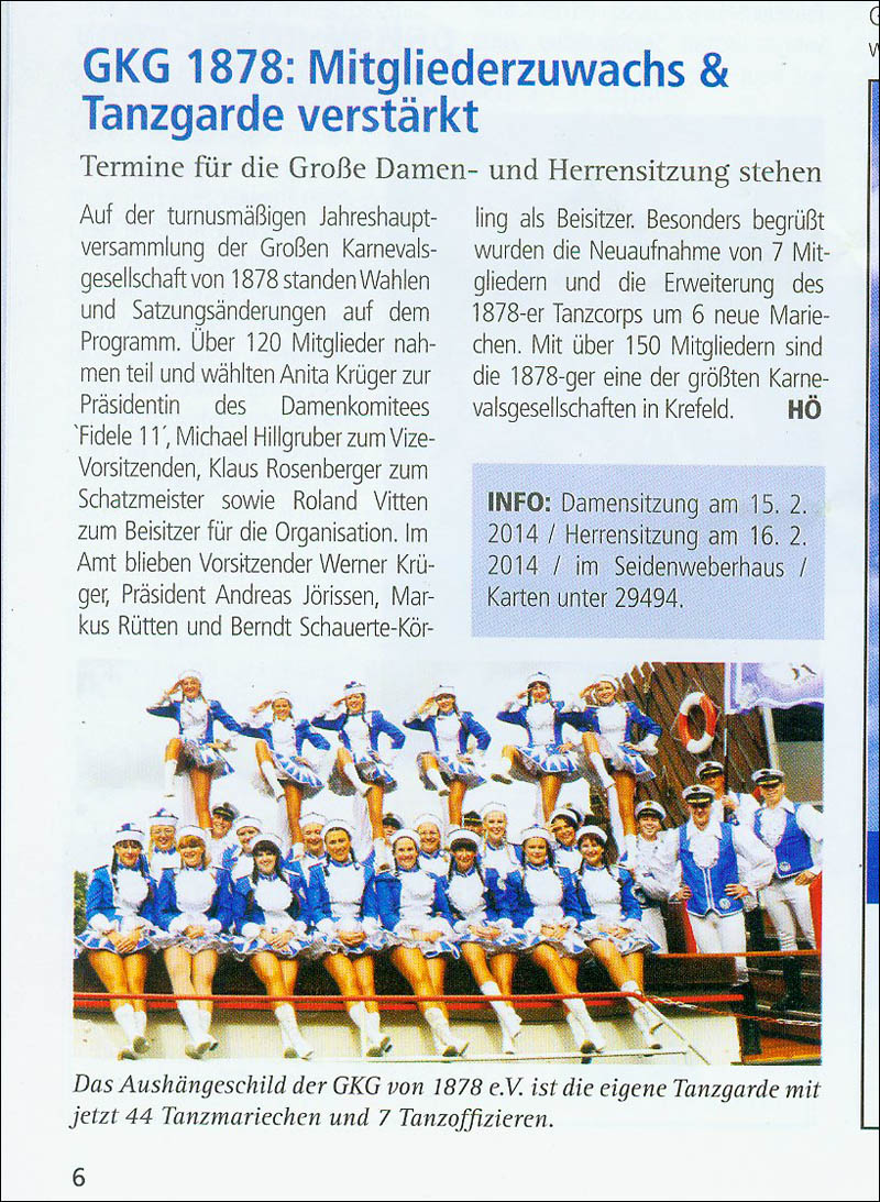 Das neue Jahr begann mit dem Jubiläum unserer Garde: „11 Jahre Tanzgarde GKGK 1878“ Am 7. Januar 2012 feierten wir gemeinsam in der Museumsscheune in Linn ein tolles Fest. Die Laudatio hielt der allseits bekannte „Advokat“ Helmut Höffken. Unsere Garde zeigte da ihr Können mit den neuen Jubiläumstänzen. Gleichzeitig wurde unser neuer Jubiläumsorden 2012 vorgestellt. Auch die große Jubiläumsfestschrift 2012 mit über 100 Seiten hat viel Anklang gefunden. Das Layout dieser Festschrift liegt seit Jahren in den Händen von Dietmar Hanssen, Markus Rütten, sowie von Monika Rütten und Klaudia Körling.